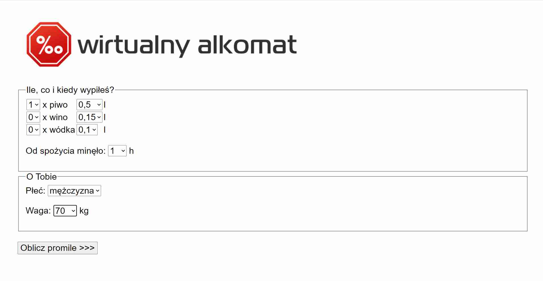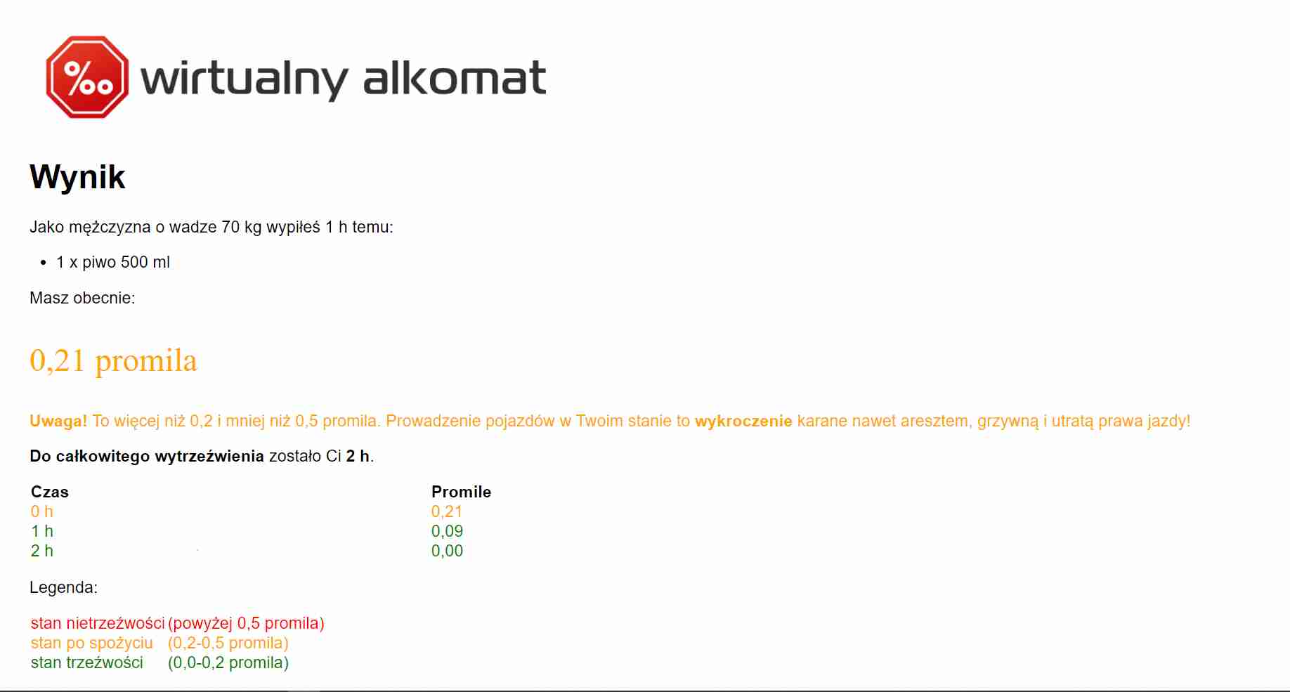 Wpisuję dane: 0,5 litra piwa, mężczyzna, 70 kg.