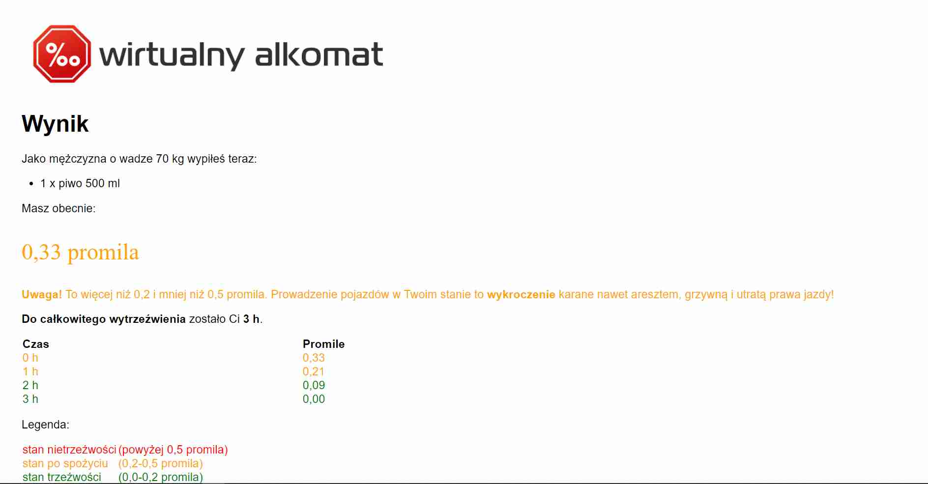 Bezpośrednio po spożyciu alkoholu wg kalkulatora są następujące dane : 0,33 ‰ i za 1 godzinę 0,21 ‰ a za 2 godziny – 0,09 ‰, zaś za 3 godziny 0,00 ‰